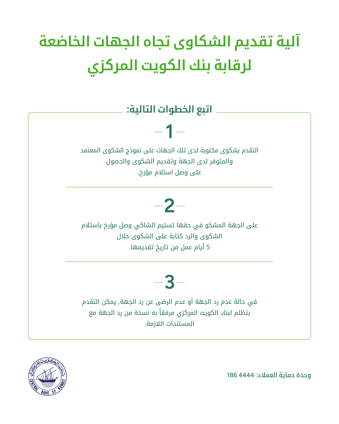 - في حالة عدم قيام بيت التمويل الكويتي "بيتك" بإزالة أسباب شكواكم المقدمة، بمقدوركم التقدم بالشكوى إلى وحدة حماية العملاء لدي بنك الكويت المركزي.